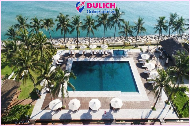 Bể bơi ngoài trời sát biển, bao quanh bởi hàng dừa.